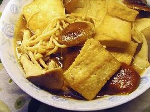 1.先将冬菇洗净,切片,用少许(约半茶匙至1茶匙)糖、生抽、老抽和麻油腌10分钟用,炸豆腐沥水备用。