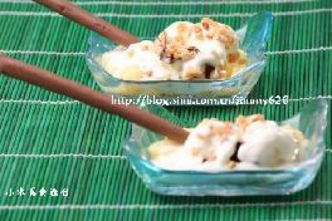 2、 将冰激凌融化少许,加少许糖桂花提味,和碎了的日本豆腐搅拌均匀,