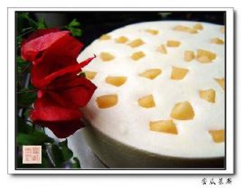 4.7.把慕斯糊倒入模具,冰箱冷藏一晚。8.取出冷藏好的慕斯。9.倒扣在盘中。10.用吹风机稍事吹一下周围,来辅助脱模。