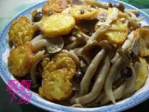 4.全部煎好后都盛出,不用另加油,将两种菇一起倒进锅里翻炒,加盐和生抽,刚才玉子豆腐已有一点盐了,菇里就不要多了,它们很易咸的;
