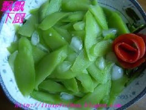 1.将莴笋去掉硬皮后,斜切片,用水(水不要多,里面要加点盐)焯熟过冷后,放在冰块上。