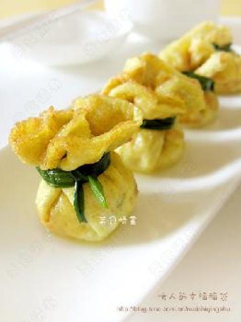 4.做好需要的蛋饼后,将搅拌好的馅料包进去,然后用烫软的韭菜或芹菜固定,最后放入蒸锅蒸8-10分钟就可以了,主要是为了将里面的馅料蒸熟,具体时间要根据你放入的馅料多少来决定。