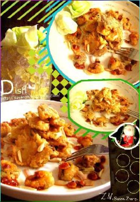 3.我们把海虹先放在鸡蛋液中在放置面粉液中,最后再挂层鸡蛋液。一个个来)。