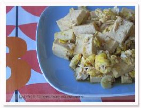 1.鸡蛋直接打入热油锅,用筷子迅速打撒,凝固一半以后放豆腐块,