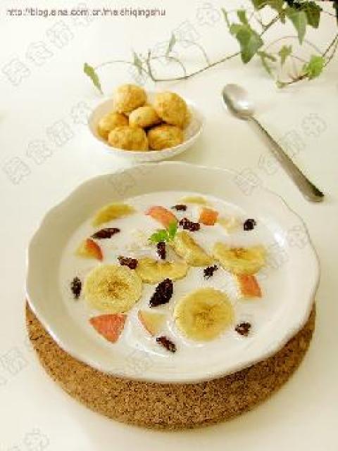 即食燕麦片2大匙,鲜奶1杯,苹果1/4个,香蕉1/2根,葡萄干若干。