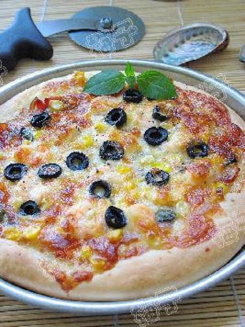 4.面团擀成烤盘大小.放入已抹油的烤盘.用手推成中间薄四周厚的面饼.扎几个小洞(厚面饼就不用扎)在面饼边的四周抹一层橄榄油.放入馅料.顺序是从底层起:奶酪----肉.菜---玉米---黑橄榄---奶酪.