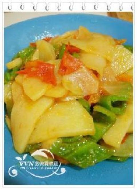 2.顺序是先放土豆片,再放青椒,最后放西红柿~