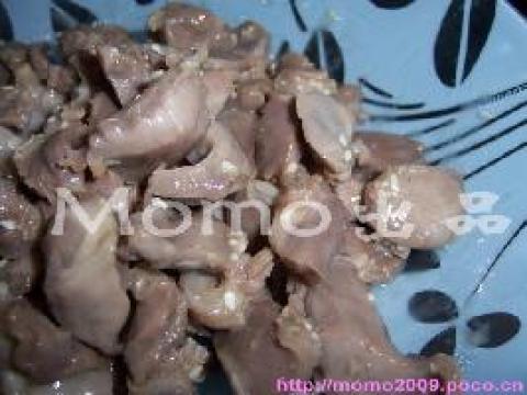 1.鸡肾洗净后切片,然后用适量盐焗鸡粉和盐腌制2小时。