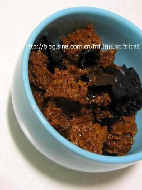 3.油锅热了以后放入烤麸,翻炒几下,倒入老抽(量以让烤麸变成满意的颜色为准),加少许盐;之后再放香菇和木耳(原因是香菇很吸味,所以容易咸);