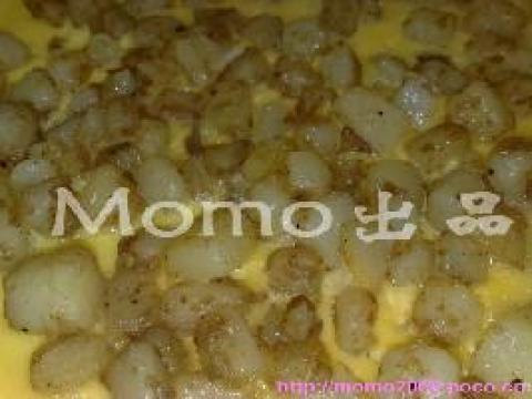 5.炸好的土豆和洋葱捞出,用厨房纸吸干油分,放入鸡蛋液中拌匀,并用适量的盐和黑胡椒调味。