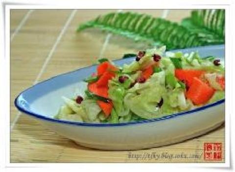 圆白菜1根,胡萝卜1根,香葱1根,白醋少许,盐少许,白糖少许,花椒少许,熟白芝麻少许,香油适量