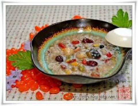 红枣适量,莲适量,芸豆适量,花生适量,红豆适量,绿豆适量,黑豆适量,枸杞子适量,葡萄干适量,紫米适量,大米适量,江米(糯米)适量,冰糖适量