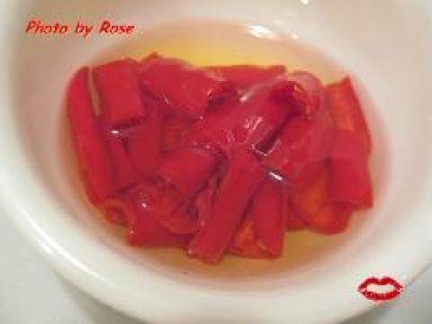 3、将切好的红椒米加入蒜末、姜丝、鸡精、盐拌匀,放入空瓶内,盖上盖子闷3天即可。