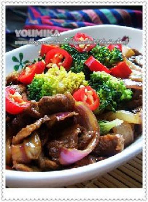 牛肉,糖,西兰花,鸡精,洋葱,咖喱粉,红辣椒,油少量,醤油