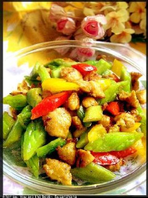 4.锅中留少许油,将鸡米花、苦瓜、青红椒放入锅中,倒入调好的汁,翻炒均匀。