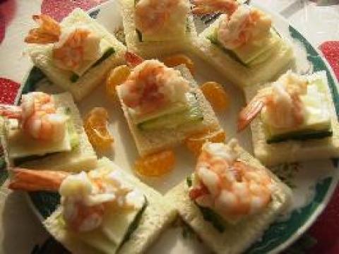 3.然后,在面包片、黄瓜、奶酪、虾上分别沾一点沙拉酱,叠在一起,装盘。