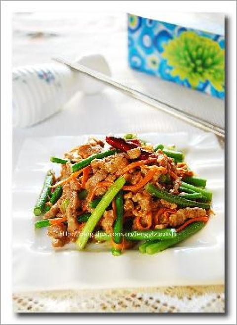 4.锅先烧热,加入2大匙油,热油下牛肉丝,快速搅拌牛肉丝变色即捞出,转中小火原锅炒香大蒜,推入胡萝卜丝炒转后,把干红椒放入,开大火推入牛肉丝,倒入兑汁,快速翻炒等兑汁均匀裹住牛肉丝后加入蒜苔炒匀就关火。用预热再翻炒几下就盛出。