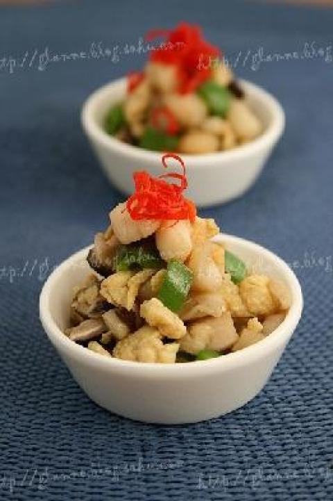 贝柱200克,青椒1个,红椒1个,鸡蛋2个,香菇5朵,盐8克,白糖5克,料酒30毫升,水淀粉15毫升