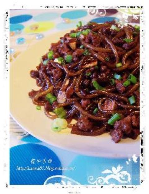 3.油锅烧热(油适量多点),爆香姜末和葱花,倒入泡好、沥干水份的粉丝,大火快速翻炒,炒时加少许食盐,生抽,再倒入事先炒香切碎的肉末,拌炒均匀,出锅前洒少许葱花,即可。