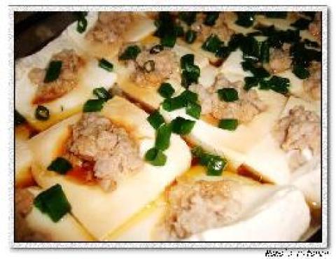 3.把猪肉碎镶入豆腐里,摆好碟,下少量的油和酱油在豆腐表面。