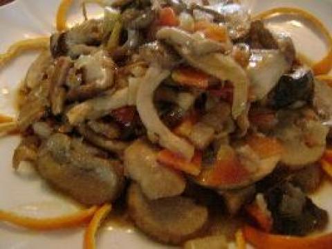 2.炒锅上火,注入清油(喜欢西餐的朋友可以放点黄油,偶不喜欢),油锅热以后放入咸肉炒出油以后在放入土豆 胡萝卜 洋葱片略炒,在把各种菇倒入,加适量的盐 红酒和黑胡椒粉炒至菇类软塌出锅。