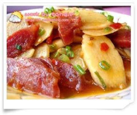 4.倒入香肠。烹入盐和鸡精。放少许水,焖2分钟。出锅前调入少许醋即可。