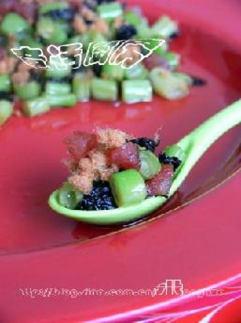 四季豆(摘去豆筋)250克,香肠1根,梅干菜,肉松(量自由放)