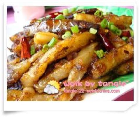 2.煎好后放入葱、辣椒、蒜、姜、酱油、花椒面、盐、糖、秘制牛肉辣酱、少些开水,炖一会儿即可。