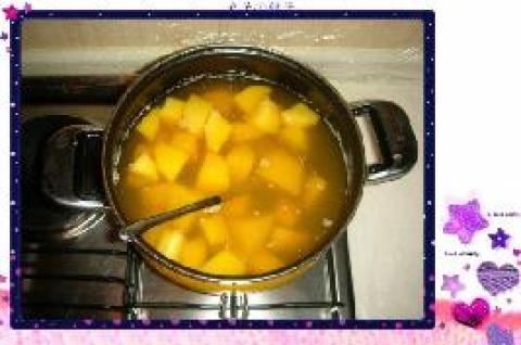 1.将桃子洗干净,去皮,切成小块,放入锅内,加入果珍;