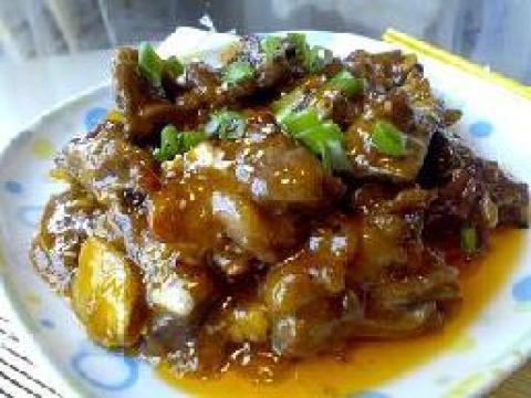 3.锅留底油,爆葱姜末,加老抽、盐、鸡精、糖、一碗水煮开,加少许醋,立即用水淀粉勾厚芡。