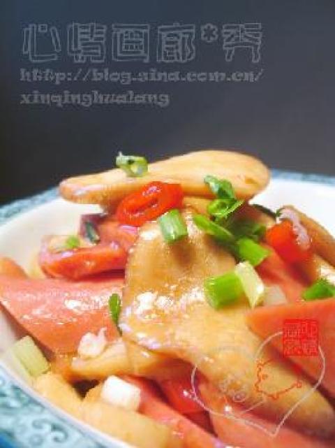 1.火腿肠切大片,杏鲍菇同样大片(被我在超市遇见大个滴,真是爱s啦~),红辣椒切小圈(装饰作用),葱花~