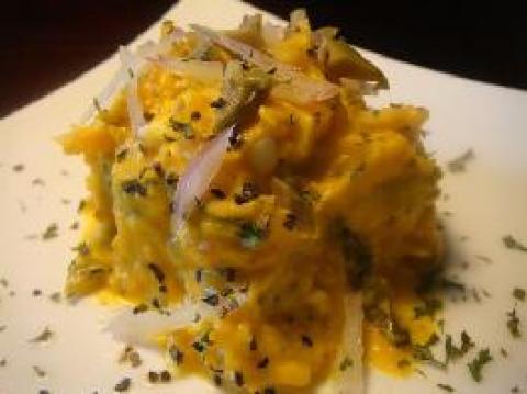 1.蒸熟南瓜泥,加入美乃滋,鲜奶油,法式芥末酱,(3:1:1:1)再加入少许橙汁拌匀.