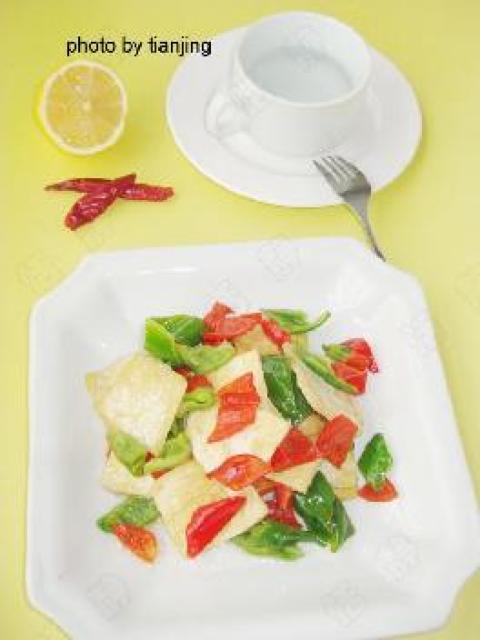 4.重新放油,放青椒和红椒煸炒,再放入豆腐,接着再放柠檬汁、糖、盐,煸炒后即可盛出。