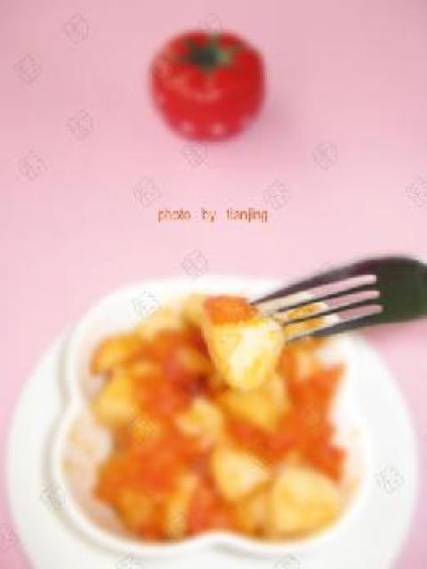 3.热锅倒油,放番茄翻炒变软出水,放番茄酱继续番茄炒,倒入荸荠炒匀,似情况少加点水,并放糖和盐,最后用水淀米勾芡即可。