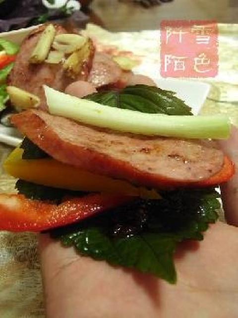 3.将洗净的紫苏叶铺在手上,然后抹上一层韩式辣椒酱,将火腿片铺上,放上彩椒丝和小葱、蒜片包裹成卷状,即可享受美味啦~~