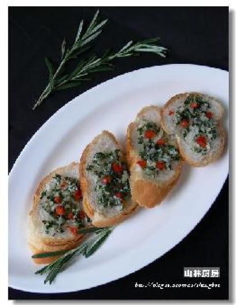 1.剩法棍切成薄片(因为是用电磁炉烤,我没切厚),黄洋葱剁碎,新鲜迷迭香切碎(洋葱量要比迷迭香量多),红椒切碎。把葱碎迷迭香碎和黄油、盐一起拌匀。