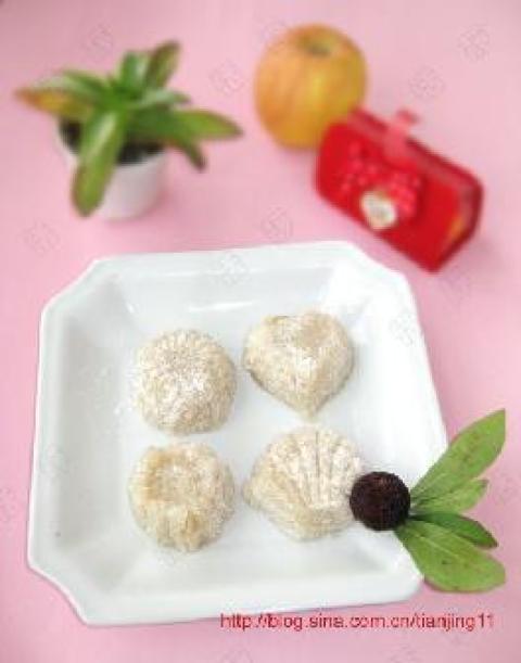 茯苓10克,山楂1小把,陈皮1小把,鸡内金粉3克,糯米粉15克,粘米粉45克,澄粉30克,糖40克,椰丝适量