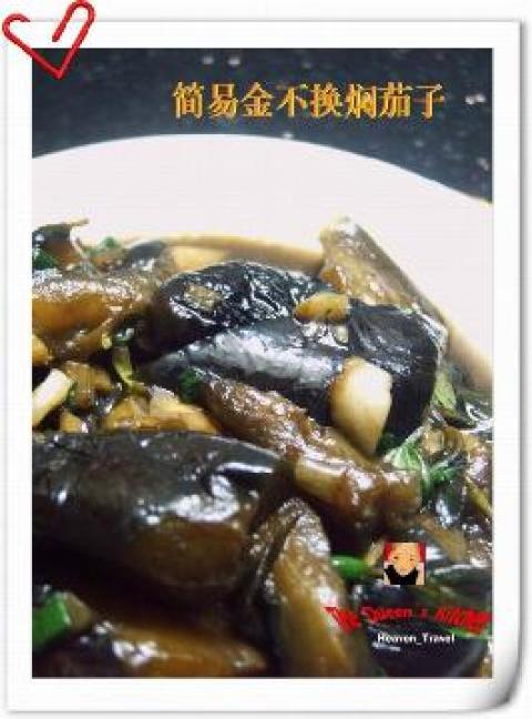 茄子一根,料酒,金不换一碗,麻油,油,女王牌香草豉油,砂糖,姜,蒜