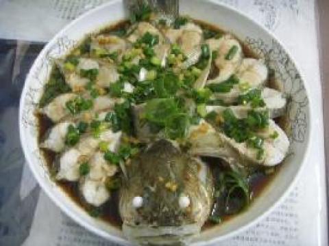 6.鱼蒸好后,把鱼汁去掉,洒上葱花.然后另起锅,油烧热后,把调好的 酱油放进烧开后淋在鱼上,洒上葱花就大功告成了.
