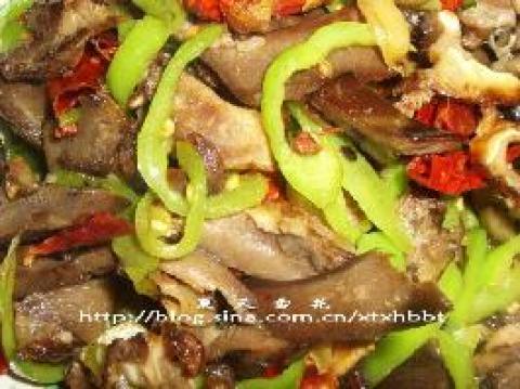3.出锅前放入青椒翻几下,加入鸡精即可装盘。