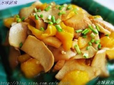 白灵菇两个,黄彩椒一个,葱,姜,蚝油,食盐,料酒
