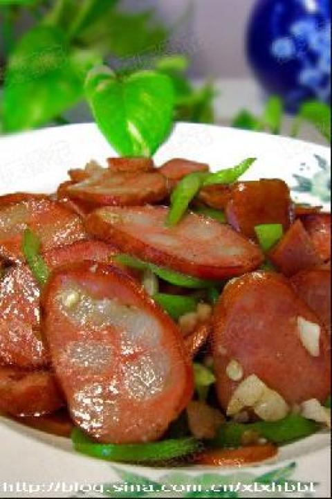 2.煎至红肠呈透明状,加入大蒜,尖椒一同翻炒;