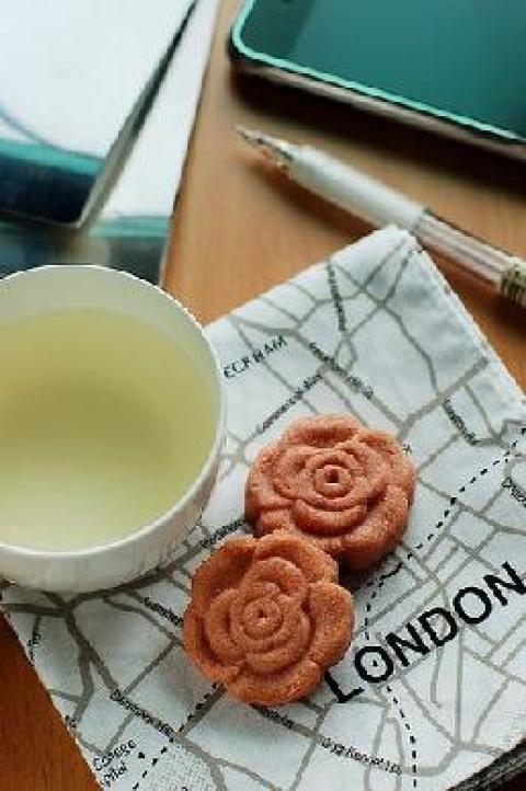 覆盆子粉10克,玫瑰水10克,鸡蛋40克,黄油90克,糖粉40克,低粉160克
