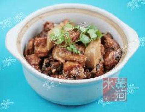 3.将材料起锅转置砂锅里,拌入蒜粒,铺上青蒜片,淋香醋,上盖。置砂锅于炉上以小火烧热。