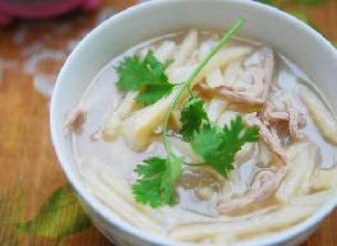 4.放入煨好的里脊丝,适量盐、白胡椒粉、,如果汤的黏度不够,可以用淀粉做个勾芡;