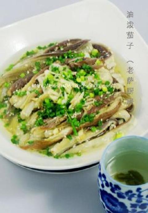 3.倒去茄子里渗出的水份,在茄子上方上蒜茸和葱花,以热油淋之即可。