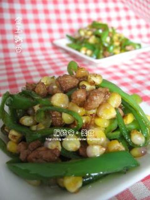 4.锅内放油,稍热,放入葱末、蒜末煸出香味,之后放入肉粒、花椒粉,翻炒,之后放入玉米粒,耐心翻炒至玉米粒变成金黄色,并出现沙沙声,滴入少许生抽,放入尖椒丝、盐和少许白糖,大火翻炒,至尖椒表皮起皱,即可出锅。