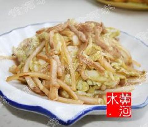 3)适量油,大火烧旺,下肉片翻炒至变色,下白菜条煮烂,即可装盘上桌