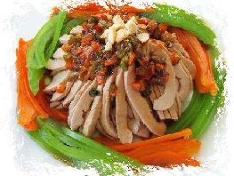 8.腰花装盘,青红椒丝烫熟围边,浇上醉汁即可.