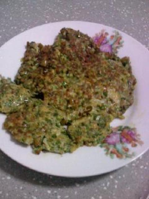 5.把搅拌好的鸡蛋、辣椒、鸡肉放入锅中,现在你看到煎蛋己经成形!